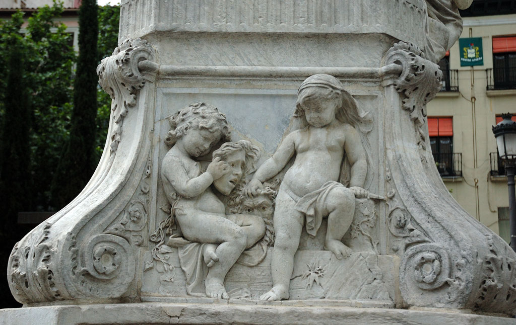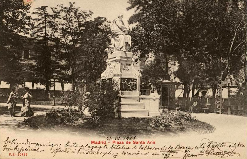 La situación de la estatua a variado con el tiempo.Yo la recuerdo mas en el centro de la Plaza o incluso mas proxima al Teatro Español. Tambien recuerdo recorrer con mis manos de niño (correrian los primeros años de la decada de 1950), los relieves de las escenas de sus obras que hay en las cuatro caras de su base, mientras disfrutaba de alguna de las golosinas que habiamos comprado a la"pipera" que había entonces, ¿Balbina? ¿Sabina?. ¡Que tiempos!. Por cierto la foto es buena.