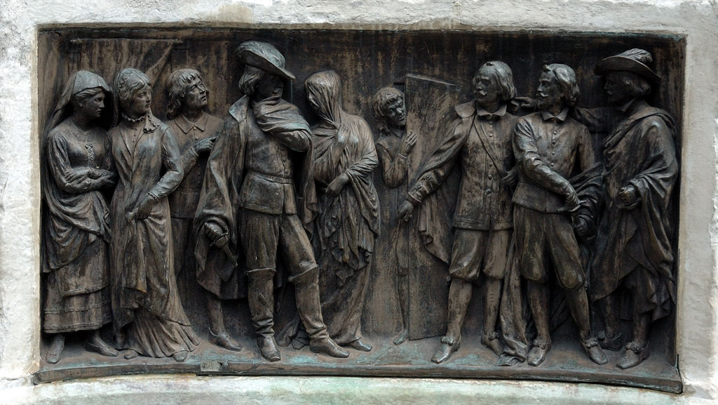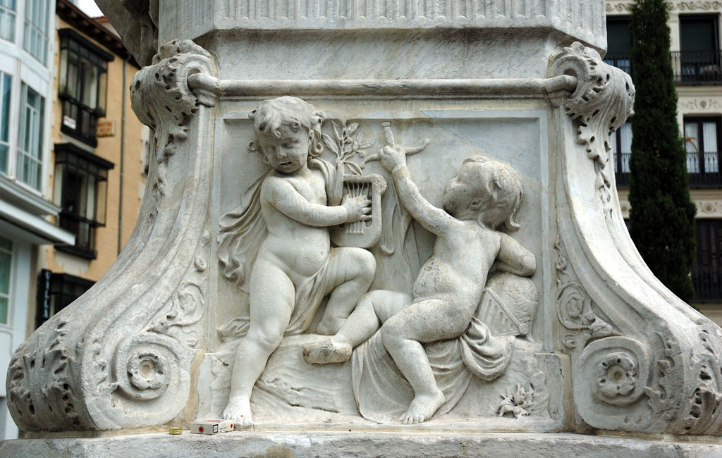 El cuerpo inferior, que no se aprecia en la foto, tiene las esquinas ochavadas y en sus cuatro caras hay relieves en bronce que representan escenas de sus principales obras: «La Vida es sueño», «El alcalde de Zalamea», «La Danza de la Muerte» y «El Escondido y la Tapada». Estos bajorrelieves se hicieron en la Fundición Nelli, en Roma, y están firmados por el mismo autor.