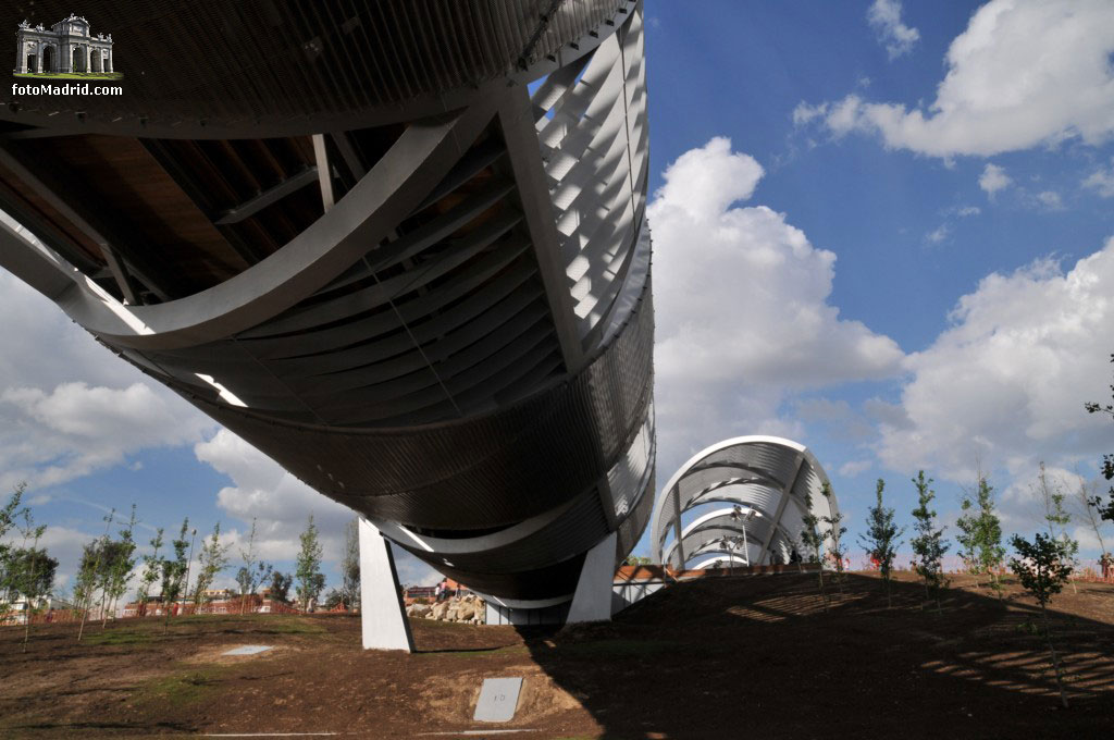 Está formado por dos grandes conos metálicos a base de aros concéntricos que confluyen desalineados sobre la cima de una colina, salvando así el rio Manzanares. Esta cima servirá como mirador y además facilitara el acceso a los parques inferiores por medio de dos sendas que descienden hasta los jardines de ambos lados del puente.