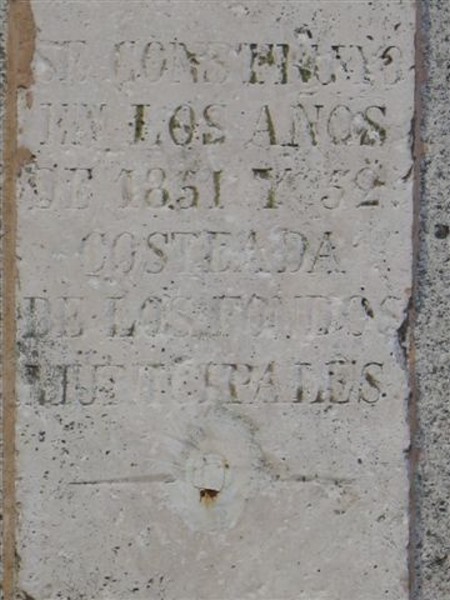 La inscripción conmemorativa, de difícil lectura, así lo certifica: “SE CONSTRUYÓ EN LOS AÑOS 1851 Y 1852 COSTEADA DE LOS FONDOS MUNICIPALES”.