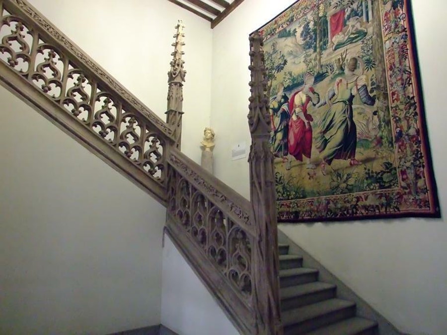 Labrada en piedra blanca caliza, es un hermosísimo ejemplo del arte gótico, diseñado también por alarife morisco Maestro Hazán, al igual que la portada. Muestra un liso pasamanos con los laterales delicadamente labrados con elementos vegetales imbricados en elementos zoomórficos. El pasamanos se asienta sobre dos series de arquerías de anchos y poco elevados arcos ojivales; seis en el tramo superior, y cuatro en el tramo inferior. A su vez, todos y cada uno de estos arcos ojivales engloban “crestas” características del gótico final, constituidas por dos finas molduras caladas en su base, oblongas y separadas por florón invertido, y una tercera superpuesta, rematada con delicado florón que culmina en el vértice de la ojiva que las rodea. El basamento de la barandilla, ligeramente cóncavo, se delimita por finísimas moduras en escocia. La barandilla se articula en ángulo recto mediante tres pilares compuestos de fuste central rodeado de pequeñas columnillas adosadas, algunas rectilíneas y otras con curioso desarrollo helicoidal, superponiéndose a alguna de sus compañeras. Naciendo de altos y finos plintos, rematan en estilizadísimos capiteles, a modo de pináculos. Cada uno de los tres pilares remata en llamativos pináculos góticos, siendo tan sólo original el que aparece embutido en junto a la jamba izquierda de la puerta de acceso a la primera planta. El estar a resguardo del muro ha posibilitado su conservación; los otros tres restantes se encuentran reconstruidos, siendo su desaparición antigua, según evidencia un grabado de la “Guía de Madrid” de Ángel Fernández de los Ríos, editada en 1876.