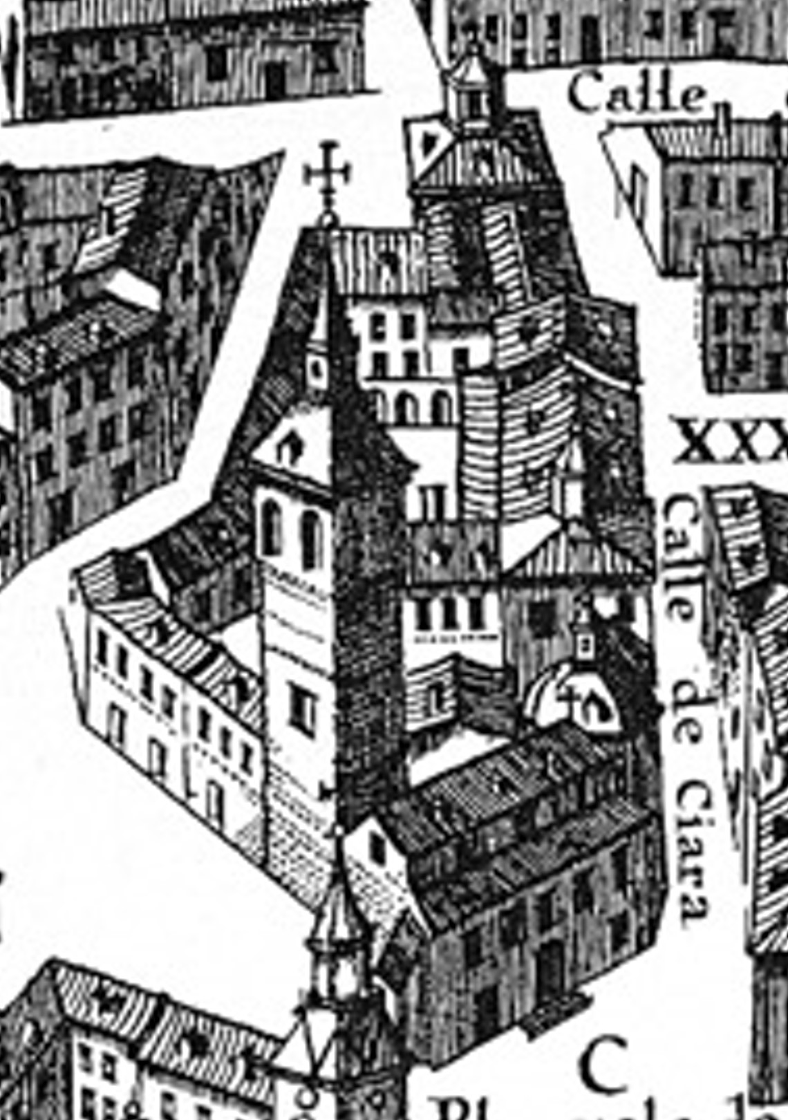 El edificio de este convento lindaba con la iglesia de Santiago y tenía frente a él la iglesia de San Juan Bautista, derribada por orden de José Bonaparte y en su espacio la plaza de Ramales. Ocupaba el Convento la práctica totalidad de la manzana 429 entre las calles actuales de Santiago, Amnistía, Santa Clara y plaza de Santiago, levantado sobre parte de las casas que fueron propiedad de su fundadora. En 1581 se ensanchó “la muy corta calle que va de la iglesia de Santiago a la de San Juan", y se reedifica por ello parte de la clausura del Convento. En el año 1619 se labró la portería. Fue derribado en 1810 de acuerdo con la política urbanística de José Bonaparte que quiere dar mayor prestancia al espacio que rodeaba el Palacio de Oriente. Es José I conocido como “Pepe Plazuelas” por las que abre durante su reinado como es el caso de las plazas de Santiago, San Martín, San Miguel, Ramales, Santa Ana, Mostenses… para abrir espacios en el laberíntico urbanismo de Madrid.