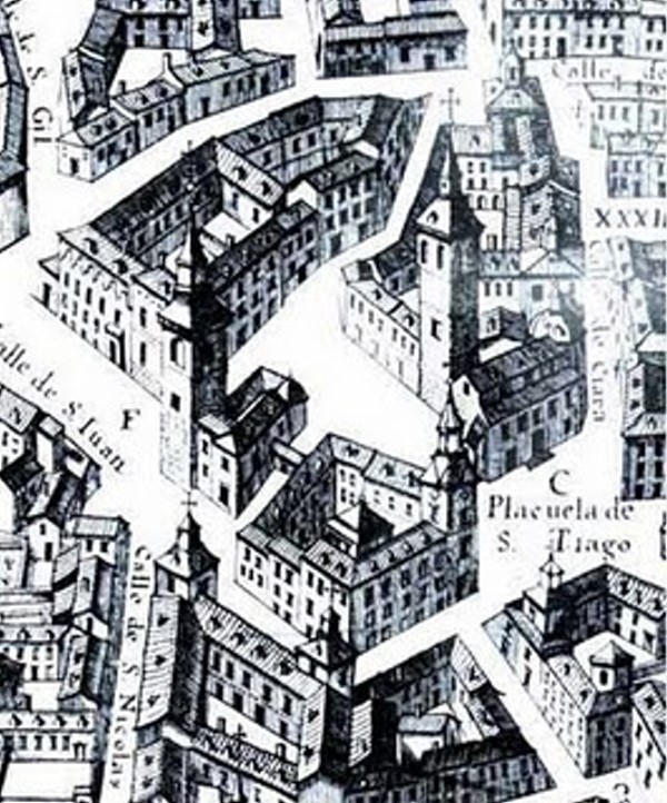 Puede ser este momento y lugar para reivindicar su paradero así como la presencia del Contador en estas calles de Madrid. Así podremos perdernos por ellas y si nos encontramos con Alonso contarle y que nos cuente. En la fachada de lo que fue la casa del Contador en Madrid una placa puesta ya en el siglo XIX nos lo recordaba, aunque de forma equivocada ya que atribuía las posesiones del Contador a los titulares del marquesado de Villafranca del Bierzo también de apellido Toledo. Eran propiedad de los marqueses de Villafranca del Bierzo y duques de Alba en el siglo XVIII las casas de la calle de Don Pedro, en las inmediaciones de la Plaza de la Cebada. En parte fueron ocupadas desde inicios del siglo XX por el colegio del Sagrado Corazón y desde 2009 por la sede de la Real Academia de Ingenieros. Está el error de la atribución de las casas del Contador a los Toledo marqueses de villafranca y luego duques de Alba en estas líneas del padre Quintana que en siglo XVII en su obra Historia de la Antigua Nobleza y Grandeza de Madrid escribe, “D. Juan II, y muy especialmente durante la privanza del célebre condestable D. Álvaro de Luna, que habitaba cerca del Alcázar, en las casas de Álvarez de Toledo, señor de Villafranca, que estaban hacia la calle de Santiago, en el terreno donde después se fundó el convento de Santa Clara”. Cuando habla Quintana de Villafranca no se refiere al de los Toledo en el Bierzo, si no al del Contador, Villafranca del Castillo. Dos familias con el apellido Toledo tuvieron Mayorazgo en la villa de Madrid. Uno de ellos es el que fundó Alonso Álvarez de Toledo en cabeza de su hijo Pedro Núñez de Toledo y el otro es el de los Toledo titulares del marquesado de Villafranca del Bierzo en León. Esta equivocación también está propiciada porque las Armas del Contador al igual que las de los Toledo de Alba tienen su escudo jaquelado de plata y azur.