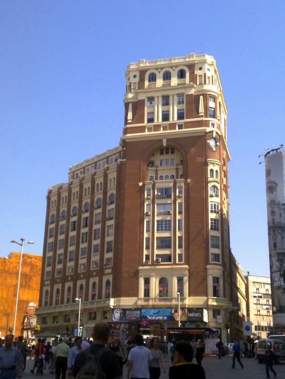 Comenzamos el tercer y último tramo de la Gran Vía, el tramo que nos llevará hasta la Plaza de España. Ahora el paisaje arquitectónico cambia radicalmente y los edificios son mucho más austeros y serios, si bien se encuentran coronados en algunos casos por bellos templetes que parecen estar destinados a convertirse en espectaculares miradores desde los que apreciar la grandeza de esta peculiar calle. Sin embargo, dicha austeridad en las fachadas contrasta con los múltiples espectáculos teatrales que le han dado el sobrenombre de “el Broadway madrileño”.