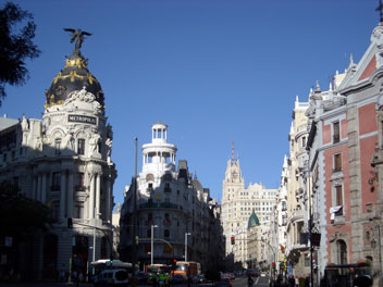 Si levantamos la mirada, nos encontraremos al frente un edificio singular, otro de aquellos edificios que dicen todo de Madrid: me refiero el edificio Metrópolis. Es un edificio de “tipo Imperio” francés, que en su primer momento estuvo destinado a ser la sede de la aseguradora “La Unión y el Fénix” y, a tal efecto, su cúpula estaba coronada por una estatua con este último motivo. Hoy, la estatua se encuentra en pleno Paseo de la Castellana, y su antiguo emplazamiento lo ocupa una victoria broncínea. El contraste entre esta dorada figura alada y la oscura cúpula del edificio conforman un vista fantástica, tanto de día como de noche. Se trata de un lugar mágico, un lugar con cuyo solo recuerdo consigo situarme emocionalmente en Madrid. Un lugar, en definitiva, para contemplar.