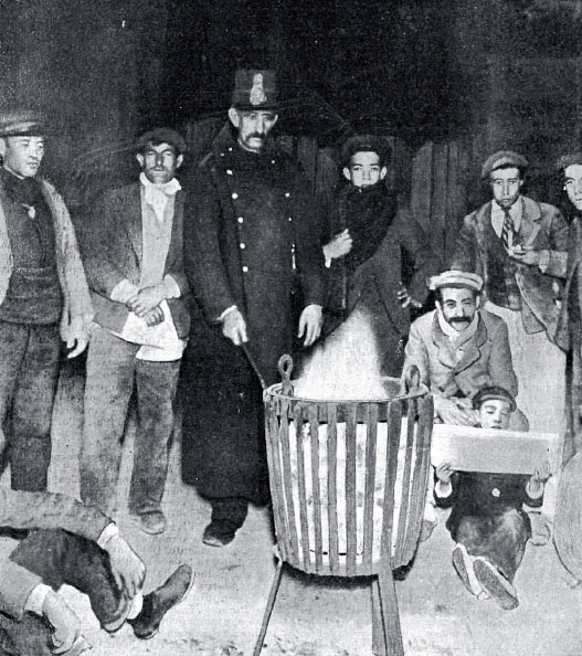 Hubo veces en que se sacaron a relucir por casos de fuerza mayor, como cuando se prohibió en 1909 dormir a los mendigos en el asilo Tovar para evitar infecciones. También se disponían con motivo de otro momento bastante menos dramático: El sorteo de Navidad. La noche del 21 al 22 de diciembre era habitual que los golfos guardasen cola para vender su puesto a los que querían por la mañana ver el sorteo. Está costumbre vivía entre la ilegalidad y la permisión y, aunque no se pudiese ejercer este comercio, las autoridades acababan haciendo la vista gorda. Eran bastantes veces los comerciantes los que corrían con los gastos de leña, carbón y cafés para los que pernoctaban a la espera de que diesen las ocho de la mañana para que se abriese el salón del sorteo y ceder el sitio al espectador de turno, e incluso en 1915 las estufas (generalmente eran dos) las proporcionó un fumista de la calle Claudio Coello [12]. El año anterior el que se dio una vuelta por la cola fue el mismísimo Eduardo Dato, que acabó repartiendo cigarrillos y dinero a los setenta individuos que se encontraban allí.