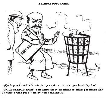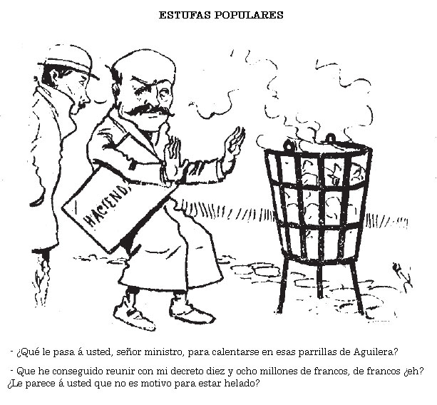 Hasta Ángel Urzáiz, Ministro de Hacienda de Sagasta, salió retratado en un chiste político de La Correspondencia Militar calentándose en las estufas callejeras [11].
