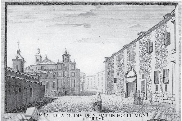 Grabado del siglo XVIII. Ya está fundado el Monte de Piedad y aún podemos ver la iglesia del monasterio de San Martín. José Bonaparte mandó derribar la iglesia y su solar sirvió para ampliar la plaza de San Martín. La portada de la izquierda corresponde a la entrada del antiguo palacio del marqués de Villena, primera sede de la Real Academia Española. Pedro de Ribera, 1681-1742, realizó esta portada barroca en 1733. Sería luego la portada de la capilla del Monte de Piedad y en algunos grabados se puede ver la campana sobre esta portada.