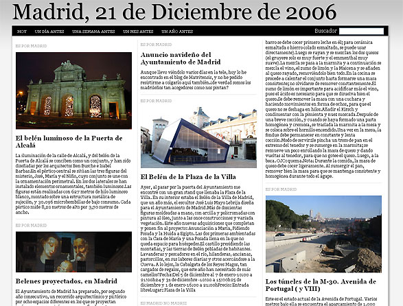 Sobre la web esta, me parece que está genial. A mi me parece muy chuli. Y se puede ver de un vistazo. Eso sí. Tiene muy poco color. Otra cosa que no me gusta nada, nada el nombre. Es más como una hemeroteca de blogs. Yo lo habría llamado blogoteca, o madriteca... ¿no? Me parece a mi que el autor no le dedicó mucho tiempo a pensar el nombre...