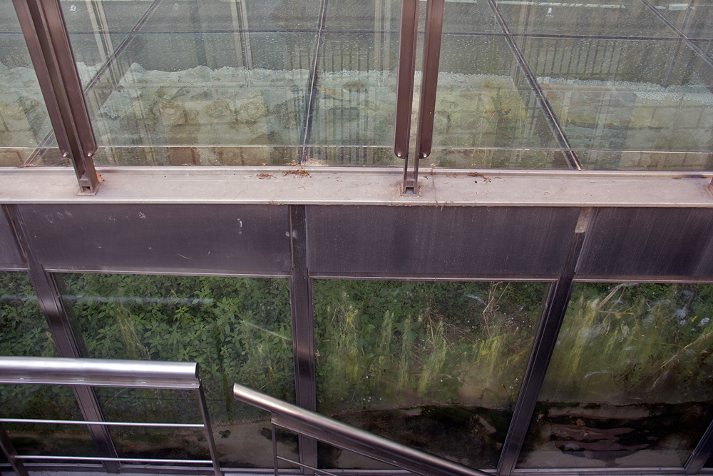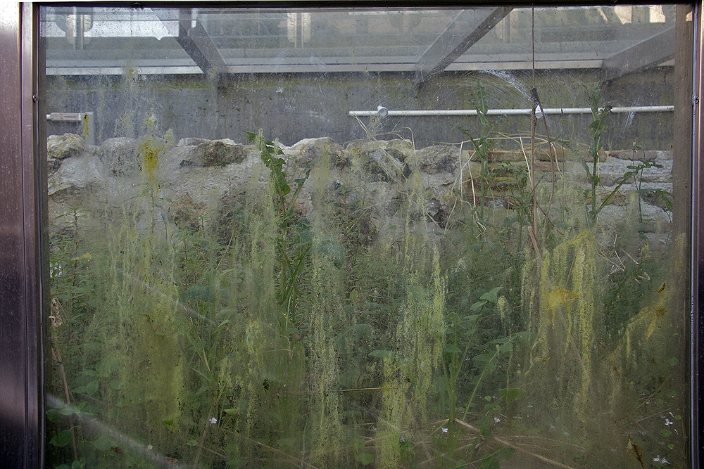 La mampara de metacrilato transparente que, a modo de ventana arqueológica, debería permitir la visión diáfana y clara del yacimiento arqueológico, no cumple debidamente su función, debido a que en la mayor parte de las ocasiones muestra su cara interior perlada de enormes gotas de agua provenientes de la condensación de la humedad interior, que ha favorecido el que, a buen recaudo de la intemperie y de las temperaturas heladoras del invierno madrileño, la vegetación silvestre haya germinado y se haya desarrollado esplendorosamente cobijada al amparo de tan estupendo “invernadero”. Lo cual nos da a entender que la limpieza y mantenimiento adecuado de los restos arqueológicos expuestos, no mantiene la debida constancia y periodicidad.