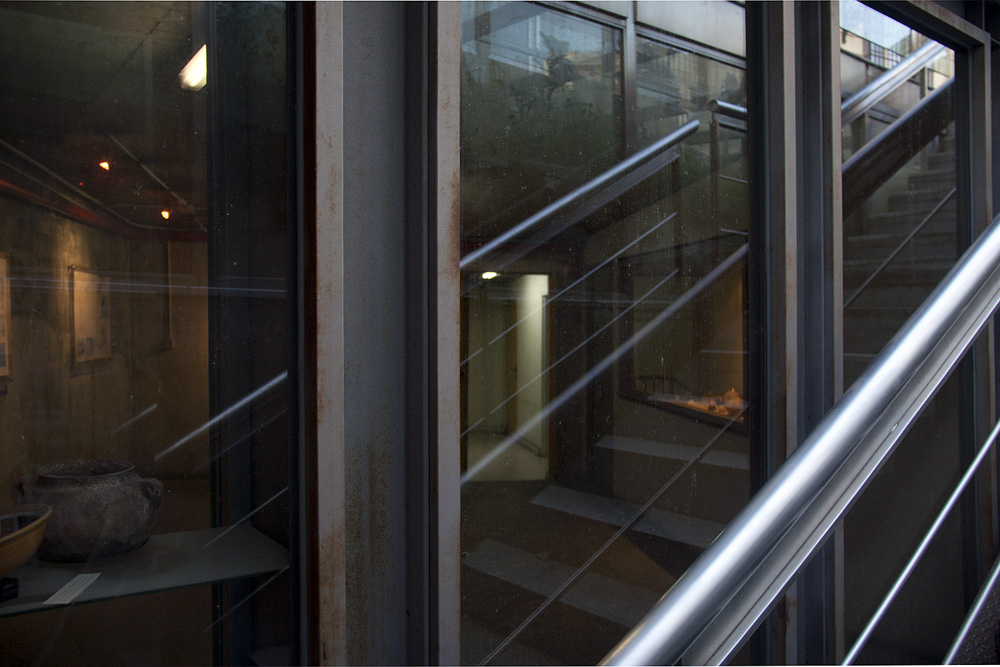 La barandilla que rodea el yacimiento musealizado de los restos de la iglesia muestra varios de los paneles de metacrilato, suspendidos sobre estructura metálica de acero cromado y cable tensado, también de acero, infamemente “firmados” con chafarrinones efectuados con ácido