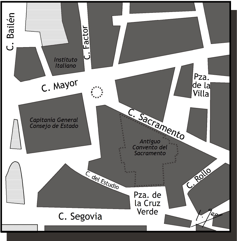 El convento del Sacramento estaba en el número 7 de la calle de igual nombre. Fue fundado en 1615 por Cristóbal Gómez de Sandoval, duque de Uceda y valido de Felipe III, muy próximo a su propio palacio, el ocupado hoy por Capitanía General y el Consejo de Estado. Para ello cedió unas casas de su propiedad y, siendo devoto como era de San Bernardo de Claraval, lo destinó a monjas cistercienses descalzas, más conocidas como bernardas.