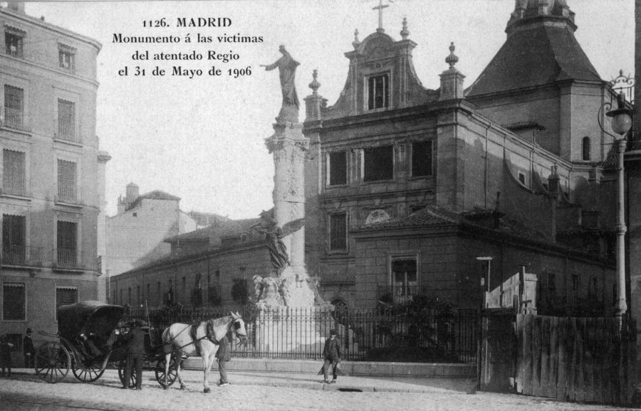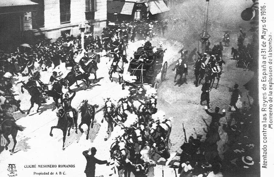 El 31 de mayo de 1906 Madrid se engalanó para un acontecimiento muy importante: se casaba el rey Alfonso XIII con doña Victoria Eugenia de Battenberg, la nieta preferida de la reina Victoria de Inglaterra. La boda se celebró en la iglesia de los Jerónimos. El cortejo real regresaba por la calle Mayor hacia el Palacio Real, el anarquista Mateo del Morral arrojó una bomba oculta en un ramo de flores desde una altura de dieciocho metros. Eran las dos menos cuarto de la tarde. En apenas unos segundos la carroza real quedó salpicada de cristales y el vestido de novia de la reina, ensangrentado. El cochero resultó herido y uno caballo muerto.