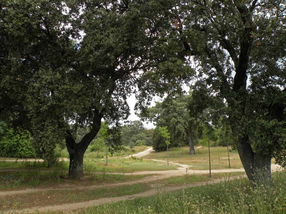 Para los nostálgicos tenemos también un recorrido histórico, la antigua Senda Real, que comienza en Principe Pío, por tanto para cogerlo desde Madrid Río simplemente deberemos cruzar por el Puente del Rey. Su origen data del año 1405 cuando Enrique III de Castilla decidió construir un camino desde el Alcazar hasta su casa Real de El Pardo. Hoy la senda continúa hasta hasta Manzanares el Real aunque ya es un gran logro si llegamos a los bosque de El Pardo porque a parte de un tramo pedregoso con socavones supongo originados por alguna tormenta a su paso por la Ciudad Universitaria, pasado el club de hípica se convierte en una senda muy estrecha cubierta de vegetación en la que hay que estar muy atento a las marcas rojiblancas de los árboles para no desviarse. Estas marcas son las propias de los grandes recorridos europeos, este en concreto es el GR-124.