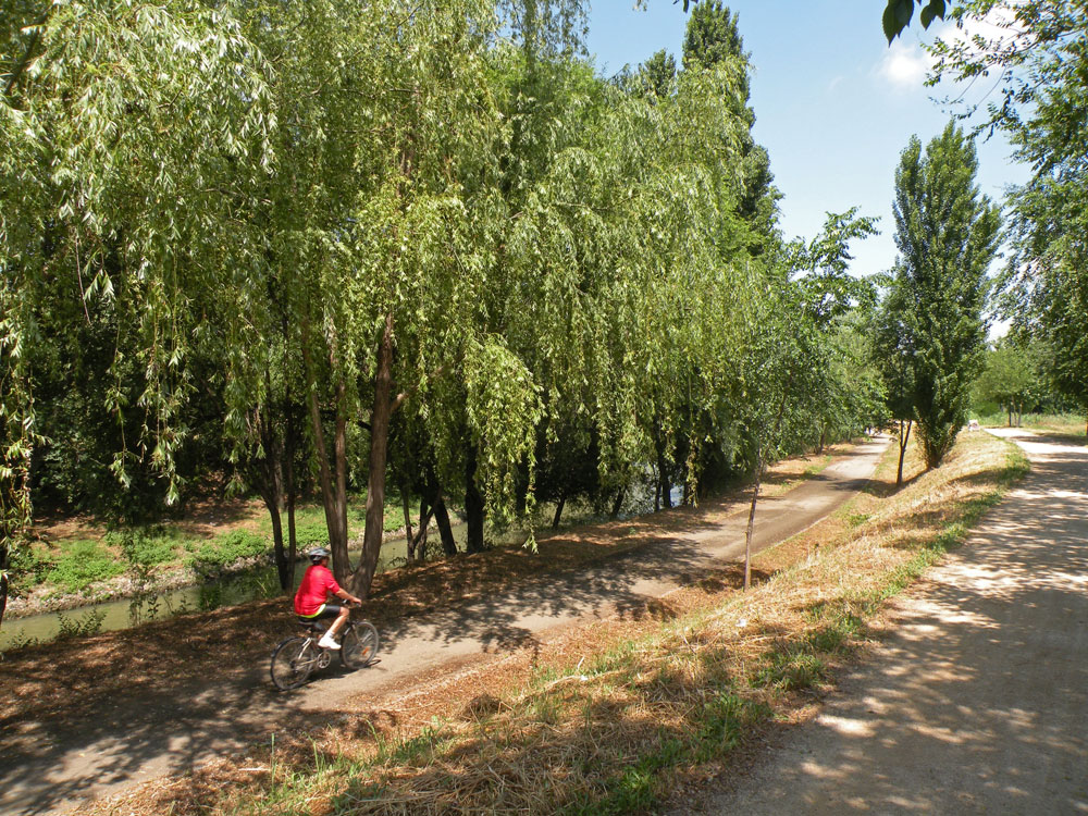 Si lo que preferimos es alejarnos de la ciudad entonces podemos volver a la ribera del río y seguirle por el Parque Lineal del Manzanares. Empezamos con un paseo tranquilo para ver como los sauces dejan caer sus lágrimas en el agua. Después de esta foto subimos de revoluciones para desviarnos hacia carretera y coger el carril bici que lleva a San Martín de la Vega. 18,2 Km desde el comienzo en la M40. La ida es tranquila, pequeñas subidas y bajadas que te van minando las piernas sin darte cuenta hasta que llega ¡nuestra primera subida a un puerto! el de la Marañosa. Si no sois aficionados quizá no os suene, pero para los habituales de este carril significa pique asegurado por ver quien lo corona antes. Tres kilómetros y poco de subida de un 2,3% de desnivel con un agradable olor a pino que para novatos como yo requiere bastante esfuerzo y buena pierna por lo que cuando un veterano que te dobla la edad te adelanta y dice "ánimo que ya queda menos" se sacan fuerzas hasta del dedo gordo del pie para seguir pedaleando. La recompensa es una bajada de casi cinco kilómetros a toda la velocidad que tu valentía te permita que deja a un lado las montañas rusas de la Warner y acaba en un bar del pueblo donde reponer fuerzas para la vuelta. Aunque si estás muy cansado haz como que se te ha pinchado una rueda y vuelve en cercanías.
