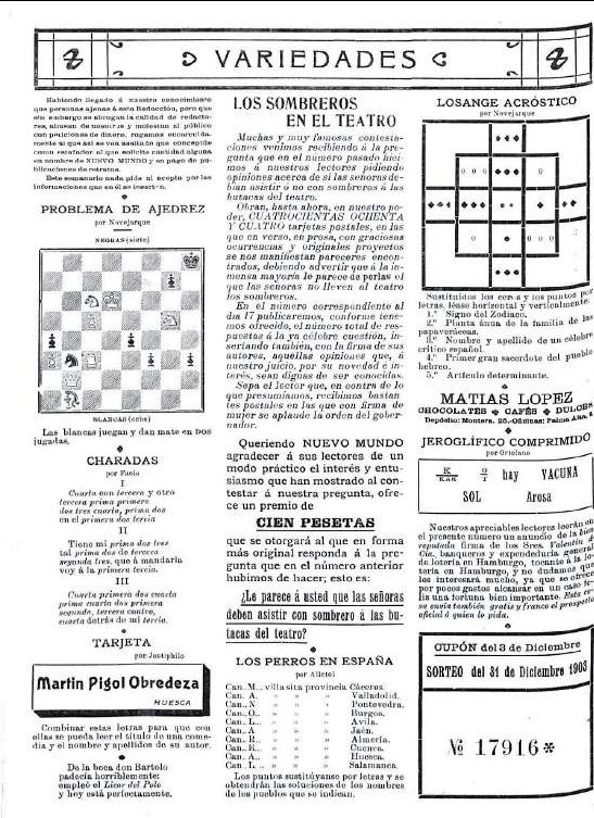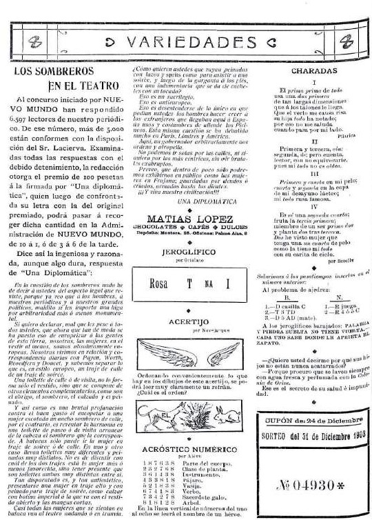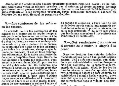 La prensa una vez más se mostró dividida, y mientras algunos se mostraron propicios otros graznaron de lo lindo. Sé de buena tinta que hasta periódicos franchutes publicaron el jaleo que se montó con to’ esto y algún exagerao patrio lo comparó con el degüello de los Santos Inocentes, que ya es comparar y ganas de meter en danza a estas creaturitas. Los más sensatos haciendo uso del raciocinio y el sentío común se preguntaban por qué el gobernador no se dedicaba a legislar otras cuestiones más perentorias y u notorias, como la higiene urbanística o la mendicidad. Incluso hubo avispaos que montaron concursos con la cuestión. En uno hasta se daban cien leandras al que mejor respondiera a la pregunta: ¿Le parece a usté que las señoras deben asistir con sombrero a las butacas del teatro?