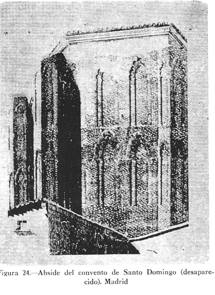 Encargado el proyecto al arquitecto D. Vicente Carrasco en 1879, en muy pocos años las religiosas pudieron ocupar sus nuevas dependencias, ampliando las actividades de su vida contemplativa con la actividad docente enfocada a niños de los dos sexos aunque - eso sí- en pabellones separados. El actual edificio es una magnífica realización en ladrillo visto del denominado neomudéjar madrileño del que afortunadamente, y aunque se han producido bastantes demoliciones, quedan numerosos y estimables ejemplos en la geografía urbana madrileña. Los antiguos pabellones escolares, se sitúan a ambos lados de la iglesia y dependencia conventual, que se retranquean en relación a la alineación general de la calle, dejando un atrio ante la portada del templo que se cierra mediante verja, si bien hay que decir que hoy día ya no se imparte actividad docente en el monasterio. El suelo del atrio, de planta rectangular, exhibe una inscripción en hierro fundido, con la leyenda “SANTO DOMINGO EL REAL. MM. DOMINICAS” con el escudo de la Orden de los Frailes Predicadores, consistente en cruz “paté” de color blanco, que pertenecía a la familia de los Guzmán. La fachada principal del templo, mudéjar en su concepción y en la disposición del ladrillo, no dejar ver sin embargo arcos de herradura, siendo todos ellos de medio punto, estando sustentada por pilastras toscanas de ladrillo, entre las cuales, y en los cuerpos de fachada segundo y tercero se abren ventanas en arco de medio punto. El segundo cuerpo muestra hornacina en arco de medio punto entre dos ventanas algo menores de tamaño pero de la misma configuración arquitectónica, en la que podemos observar escultura pétrea de Santo Domingo. Se encuentra rematada la fachada por un frontispicio triangular, centrado por un óculo, recubierto todo el frontón por decoración de "sebka”, elemento decorativo en forma de rombos, este sí de origen estrictamente islámico y muy utilizado en el neomudéjar madrileño. Se corona el vértice del frontón por cruz de forja. Las pequeñas torres laterales se rematan por sendas espadañas, con huecos de medio punto, albergando la de la derecha una campana. Las espadañas se rematan también por pequeñas cruces.