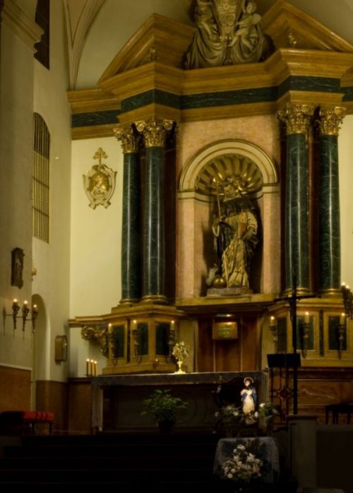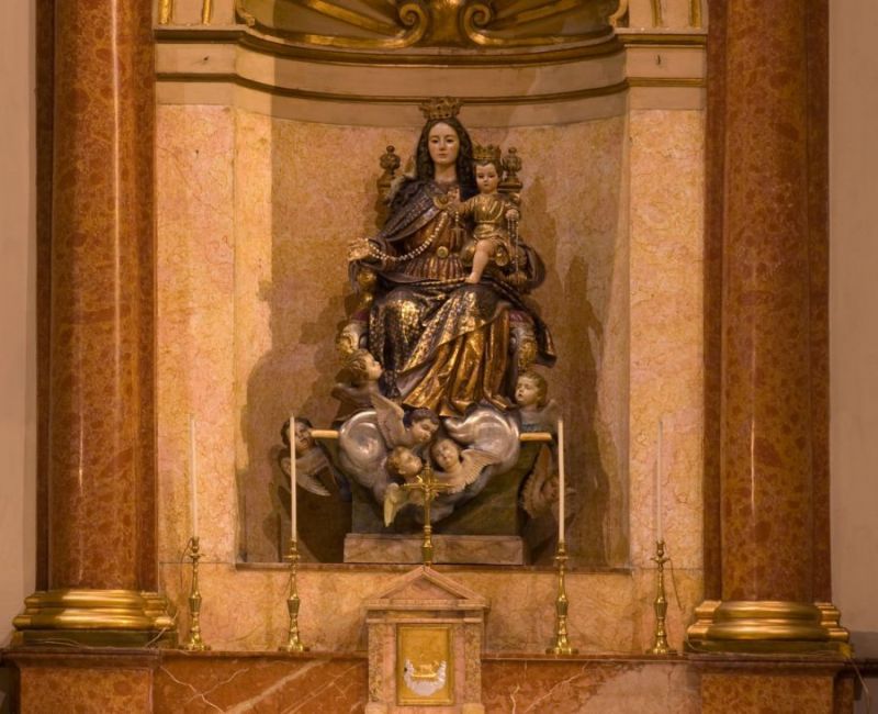 El primer retablo que encontramos al acceder al templo por la zona de los pies, y lado de la epístola, de diseño neoclásico aunque también contemporáneo, flanqueado por un par de columnas y rematado por frontón triangular, se corresponde con el de Nuestra Señora del Rosario de Fátima. Fue realizada por talleres de Olot en la posguerra, pero sigue modelos del escultor vallisoletano del siglo XVIII, asentado en Madrid, Luis Salvador Carmona (1708-1767). Se representa a la Virgen María, sentada en trono y sustentando en su regazo al Niño Jesús en actitud de bendecir con la mano derecha. La Virgen viste túnica dorada ceñida con cinturón de hebilla circular, y cubierta por un manto azul con elementos florales cuadrifolios dorados cerrado por un broche circular con rostro humano. Tiene la particularidad de llevar un ligero velo rematado por corona que permite mostrar su larga cabellera castaña ondulada.