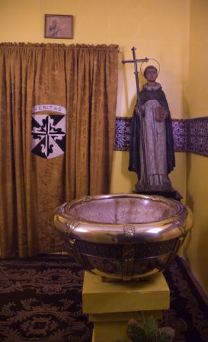Dirigiéndonos hacia la derecha desde los pies de la iglesia, accedemos por una escalera que conduce a una tribuna inferior (la superior corresponde a las religiosas), en cuyo fondo se abre una pequeña capilla que cobija uno de los tesoros de este monasterio: la Pila Bautismal de Santo Domingo de Guzmán. Procede de la iglesia parroquial de Caleruega (Burgos), lugar del nacimiento del santo en el año 1170. Fue entregada en donación por Alfonso X El Sabio a las dominicas de esta población que fueron trasladadas al Monasterio de San Esteban de Gormaz por el mismo Santo Domingo. Con posterioridad a la canonización de Domingo de Guzmán, el Rey Fernando III el Santo donó la pila a las religiosas de Santo Domingo el Real de Madrid. Se viene utilizando para bautizar a los miembros de la Familia Real española –en concreto al Príncipe o Princesa de Asturias, y a los infantes e infantas, hijos de los monarcas y del Príncipe o Princesa de Asturias-; y ello se viene efectuando desde el año 1605 en que lo fue el futuro rey Felipe IV en Valladolid (durante el período en que la capital de la Monarquía Hispánica se asentó en dicha ciudad castellana, entre 1601 y 1606), hasta la época actual. Curiosamente, nuestro actual monarca D. Juan Carlos I no fue cristianizado en esta pila al haber nacido en el exilio, en Roma, en el año 1938. La pila es de piedra blanca tallada, de aspecto similar al mármol y datable en el siglo XI. Su parte exterior está recubierta por un engaste de plata con relieves de oro realizado en el año 1771 en sustitución de uno más antiguo que se encontraba deteriorado. La parte media del engaste está recorrida por una cenefa con adornos de palmetas; los refuerzos laterales están labrados en plata bañados en oro, y la parte superior del borde la pila muestra los anteriormente referidos relieves de oro, que representan los escudos de España y de la Orden Dominica (la Cruz patada y lisada). En esta recogida capillita podemos contemplar, asimismo, tras la pila bautismal, una moderna escultura que representa a Sto. Domingo.