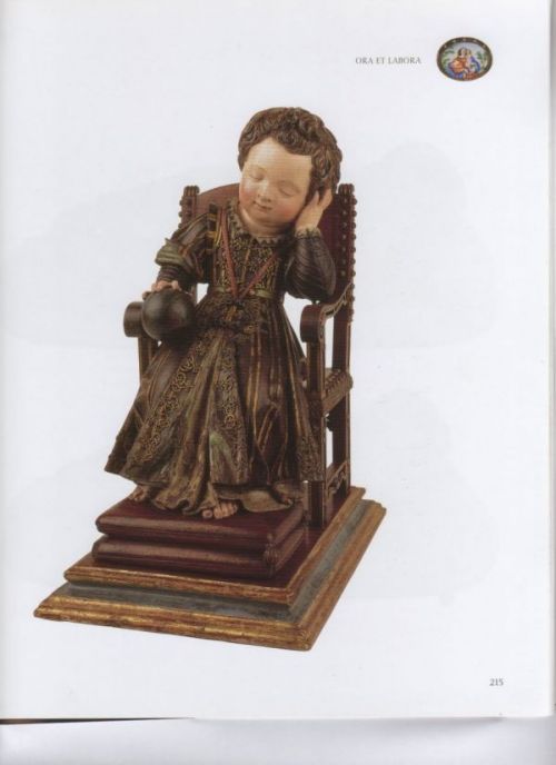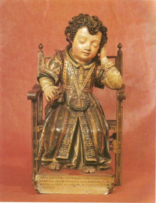 Una última joya, atribuida también a donación de la Priora Dª Constanza de Castilla, la constituye el conocido como “Niño Jesús sentado en silloncito”. Es una imagen realizada en madera policromada y estofada, con incrustaciones de rubíes según la técnica de cabujón que ornamentan su túnica exterior, parcialmente cerrada con alamares, y portando un medallón con los símbolos de la Pasión (la Cruz, el martillo, las tenazas y la corona de espinas). Con unas medidas de 44 centímetros de altura, 24 de anchura, y 20 de fondo, muestra la imagen del Niño Jesús, de edad como de dos años, dormitando sobre la palma de su mano con el codo izquierdo apoyado en el sillón. Su mano derecha sujeta una calavera, alusión directa a su profetizado Sacrificio Redentor en el monte Calvario o Gólgota, bajo el que se supone se hallaba enterrado el cráneo de nuestro primer padre, Adán. Aunque se atribuye su donación a la infanta castellana cuando ingresó en el monasterio a comienzos del siglo XV, y así lo indica una cartela a los pies de la imagen (“Esta escultura perteneció a Dña. Constanza de Castilla, hija del Infante D. Juan y nieta de D. Pedro, quien la cedió al convento de Santo Domingo el Real donde fue priora”) y la imagen ha sido datada tradicionalmente en el siglo XIV, realmente su depurada concepción estilística, así como las vestiduras que exhibe el Niño, nos haría avanzar cronológicamente su elaboración hasta el siglo XVI. Además, existen ejemplos escultóricos muy similares y perfectamente datados, como esta imagen del “Niño Jesús dormido”, de escuela española y datada a finales del siglo XVI, cuya diferencia más significativa en relación al Niño que se custodia en Santo Domingo el Real, es que en lugar de sujetar una calavera lo hace con un “orbe”, representación del universo.