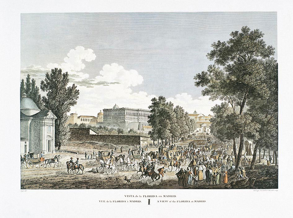 Los paseos de San Vicente y de la Florida limitaban por el sur la finca. El de San Vicente fue el de los primeros trazados que desde la muralla bajaban al Río. En el siglo XVII se le conocía como el Camino del Río y posteriormente se le denomina como Camino del Palacio Nuevo. En el año 1613 se abre una calle desde la Fuente de Leganitos hasta el Manzanares, el Arroyo de Leganitos se cruzaba por un puente, que es representado en el Plano de Wit. El Paseo de San Vicente terminaba en la puerta del mismo nombre, que era una de las entradas de Madrid. Al principio era un pequeño portillo que se derribo en el año 1770 por orden de Carlos III. Se le conoce con dicho nombre porque el portillo tenía en su arco una estatua del santo.Las obras de la nueva puerta comienzan en el año 1770 y fueron concluidas en el año 1775, siendo realizadas por Sabatini. Estaba formada por un arco de medio punto almohadillado, flanqueado por dos columnas doricas y dos pilastras sobre un zócalo. El arco estaba rematado por una cornisa decorada mediante el empleo de triglifos y castillos en las metopas. La cornisa estaba rematada por un frontón triangular con trofeos como elementos decorativos. La puerta tenía la siguiente inscripción latina “Carolus III aperta via porta structa commoditati ac ornamento publico consultum vovit anno MDCCLXXV”. Fue demolida a finales del siglo XIX para facilitar el tráfico, aunque a finales del siglo XX fue reconstruida para facilitar el tráfico.El Paseo de la Florida data del año 1768, denominándose el Paseo del Pardo, aunque posteriormente recibió el nombre actual porque delimitaba la finca de la Florida. Era un paseo bastante ancho con 4 hileras de árboles, destacando la Fuente de los Mascarones, que realizó Francisco Gutiérrez según las pautas proyectadas por Sabatini. La fuente de granito y caliza era de un solo cuerpo. Se le denominaba así porque en cada frente existía un mascaron, que simbolizaba un río. Rematando el conjunto se disponía un niño sobre un delfín con un surtidor en la boca. La fuente estaba situada al comienzo del paseo junto a la Puerta de San Vicente.Recorriendo todo el paseo conocido como Carretera Nueva de Castilla, se encontraban los lavaderos, que eran casillas junto a la orilla del Manzanares con un tendedero. El Paseo de San Vicente solía estar muy transitado por las lavanderas. En torno al año 1870, por iniciativa de la Reina María Victoria, esposa de Amadeo de Saboya, comienza la construcción de un asilo para los hijos de las lavanderas. Estaba situado frente a la Puerta de San Vicente y tenía la finalidad de cuidar a los hijos menores de 5 años de las lavanderas mientras éstas realizaban su trabajo.