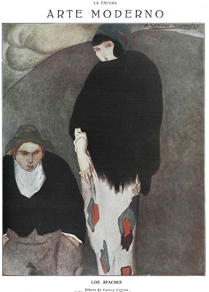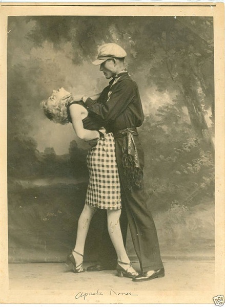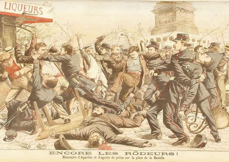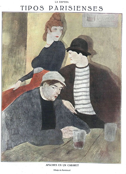 Lo primero es explicar quienes eran estos apaches transpirenaicos, precursores, a su manera, de lo que fueron los gangsters norteamericanos. Su origen está en el París de principios del XX. Eran bandas de delincuentes jóvenes, nacidos en los barrios conflictivos de la ciudad y su principal característica era la falta de disimulo sobre su condición. Adoptan una forma de vestir determinada (botines relucientes, pañuelo al cuello, un tipo de gorra característico llamada de “trois points”, etc.) y sobre todo, un comportamiento arrogante, orgulloso de su tipo de vida. Como complemento casi indispensable solían tener una amante (o más) a la que prostituían y que a su vez, solía ser cómplice y ejecutora de las fechorías de su chulo. Los responsables del nombre parece ser que fueron los periodistas Arthur Dupin y Victor Morris que en 1902 ya los llaman así.