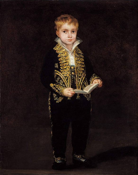 El uniforme de los pajes de José Napoleón no tenía sin embargo nada de esta elegancia rebuscada que distinguía a los pajes españoles de los reyes de la dinastía austriaca, cuando, andando a pie, el sombrero en la mano, alrededor del carruaje real, o bien, sentados en las portezuelas, acompañaban a la fiesta de toros o a la procesión de San Isidro a sus graves y magníficos soberanos. Calzas de seda negra, un jubón de terciopelo negro que ceñía en el talle un cinturón del mismo color, un ancho sombrero de fieltro con una larga pluma blanca, tal era entonces su traje sencillo y pintoresco. Además, ni capa, ni espada, sólo se veía, colgada a la cintura de los mayores, una pequeña daga de Toledo, con una empuñadura de oro ricamente cincelada y su vaina de plata esmaltada adornada de arabescos. En su riqueza, el uniforme de los pajes de José Napoleón, así como el de los pajes de la casa de Borbón, se asemejaba más a una librea que a un traje de corte. Llevábamos un frac azul marino, ribeteado de oro en el cuello, en las solapas, en las bocamangas, en el talle, y cuya pechera estaba cubierta por anchos galones de trencillas de oro, parecidos, menos en el color, a los que llevaban los granaderos a caballo de la guardia de Carlos X de Francia. Las solapas y el cuello del frac eran de terciopelo. Calzones azules apretados en las rodillas por una hebilla de oro, medias de seda blancas con grandes esquinas, zapatos con hebillas, complementaban este uniforme, que alzaba un poco un sombrero militar, magníficamente ribeteado y rematado de plumas blancas como el sombrero del mariscal de Francia, una agujeta de seda blanca, bordada de oro, atada sobre el hombro izquierdo. Y finalmente la espada, que llevábamos al costado. Sólo los pajes de servicio llevaban la bota de amazona [4].
