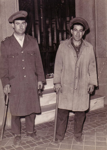 Más conocidos seguramente por los lectores eran los serenos, dedicados a labores de vigilancia y protección nocturna del barrio que les era asignado. A modo de uniforme vestían un guardapolvos y una gorra grises y portaban un grueso chuzo o porra - por si hubiera que poner firme a alguien, decían -. Se les confiaba las llaves de todos los locales y portales de su zona, que llevaban colgando en su cintura de un grueso cinturón de cuero y que por su aspecto y tamaño más semejaba una faja. Cuando alguien requería del sereno se le llamaba a voz en grito y dando unas palmadas, a lo que él respondía siempre: “Vaaaaaa”. Por cierto, que el de mi barrio se llamaba Manolo.