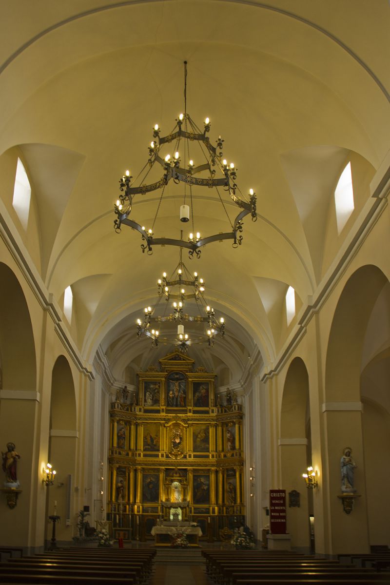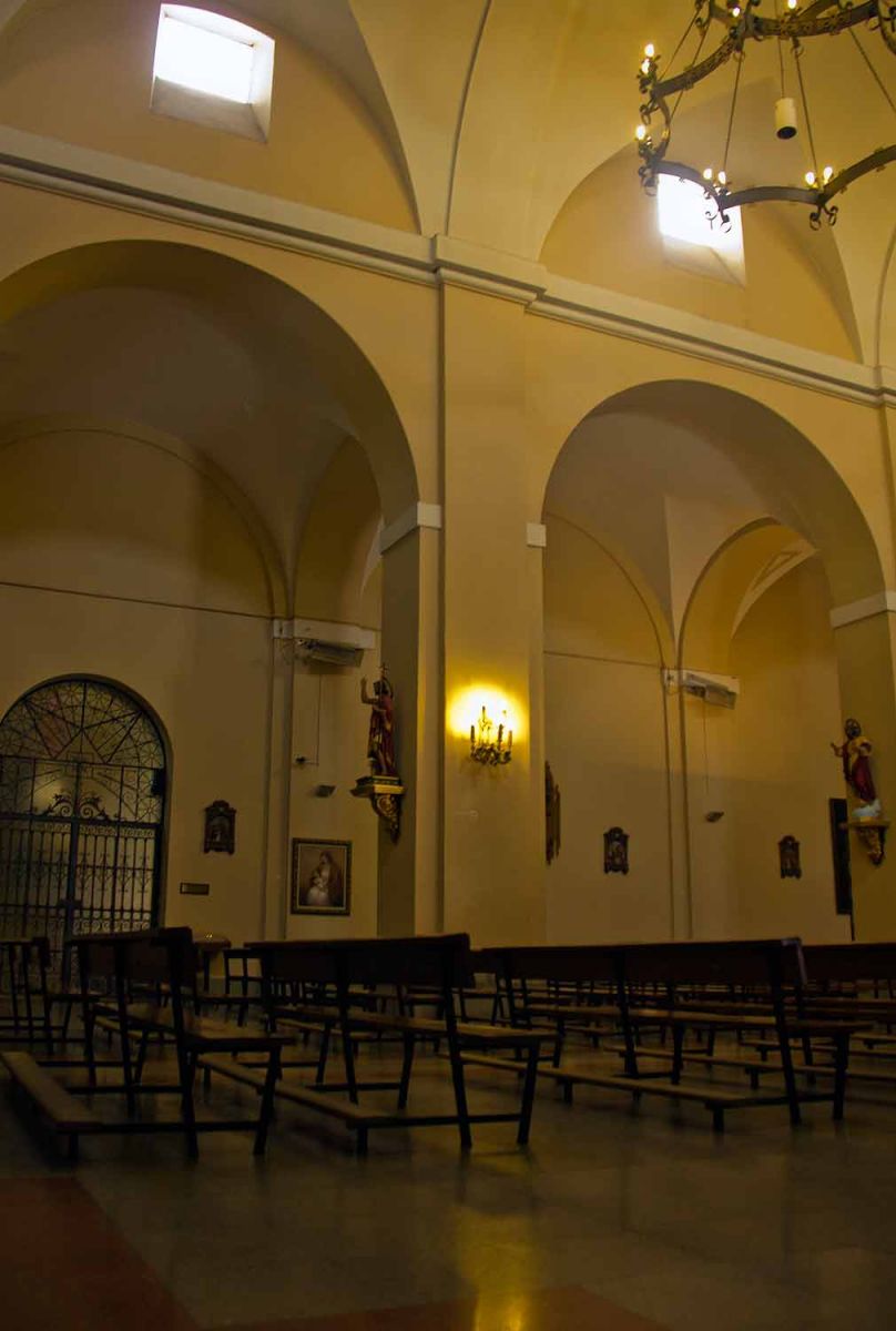 Accediendo al interior del templo, rápidamente podemos advertir su disposición en planta basilical de tres naves, más ancha y alta la central que las laterales (foto 15), las cuales se hallan cubiertas por bóvedas de arista, y se abren a la nave central a través de arcos de medio punto sustentados por pilares cuadrangulares, en los que resaltan pilastras lisas de sencillo orden toscano, cuyos capiteles se prolongan en cornisa con escocia –moldura convexa- en su parte inferior e imposta cuadrangular en su parte superior.