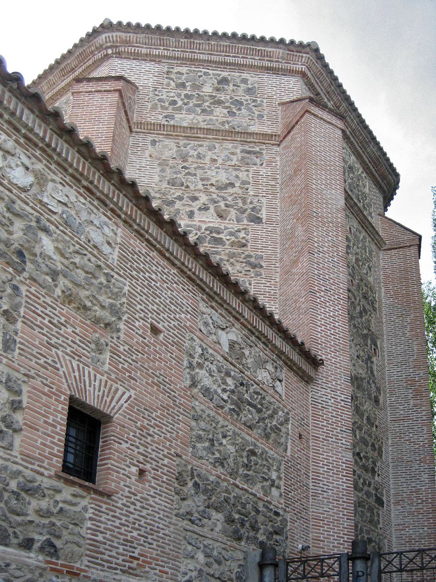 Esta enorme capilla mayor deja ver con mayor claridad su rotundidad arquitectónica observándola desde el exterior (foto 17), con su planta pentagonal de tradición gótica, y sustentada por grandes contrafuertes de ladrillo. Llama la atención la inexistencia de ventanales entre los contrafuertes, que serían de configuración ojival, y que quizá responda a la reforma general del templo iniciada a partir de 1593, que las cegaría para poder emplazar, ya en los comienzos del siglo XVII, el retablo protobarroco destruido en 1936.