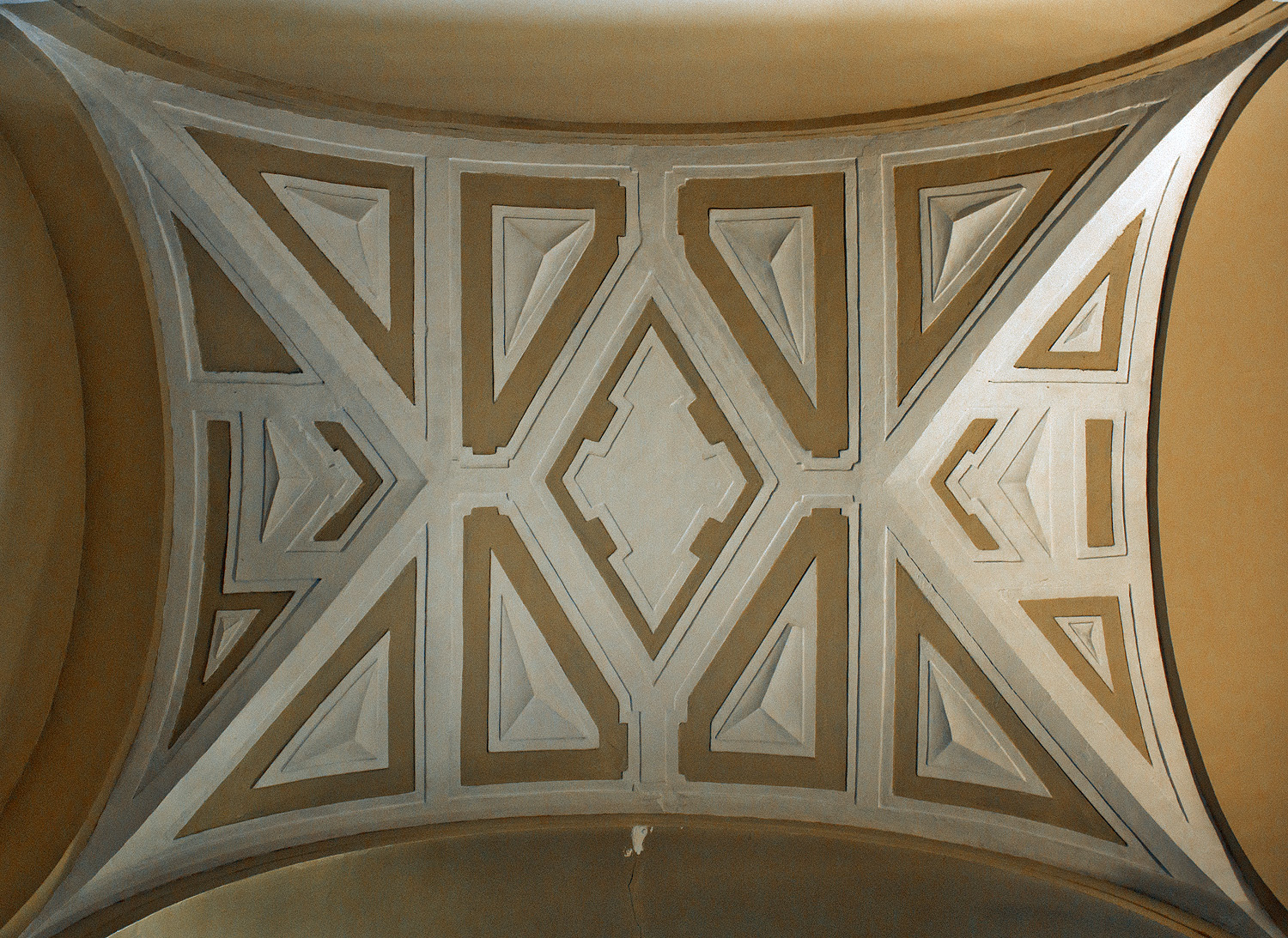 Retornando al interior del templo nos llama la atención uno de los escasos motivos decorativos que sobrevivieron al asalto y destrucción de 1936. Nos referimos a la bóveda del primer tramo de la nave del evangelio (foto 18), que muestra una decoración de yeso con motivos geométricos poligonales. Son muy similares a los que han sobrevivido igualmente en la bóveda del coro alto de los pies de la iglesia, y en la actual capilla de la Reconciliación, antiguamente Capilla de la Vera Cruz emplazamiento original de la pila bautismal.