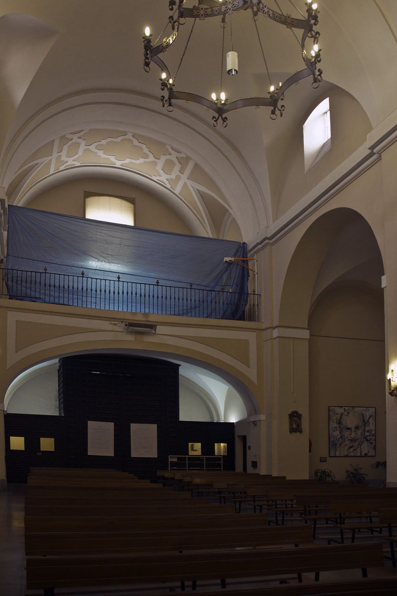 Si dirigimos la mirada hacia la portada principal, sita a los pies del templo podemos advertir la belleza del arco escarzano que sustenta el coro alto (foto 19), como asimismo las hermosas labores de yeso barrocas de su bóveda. La lona azulada nos indica que dicha zona está siendo objeto de labores de consolidación en su estructura de viguería de madera con el fin de poder instalar un órgano que sustituya al que construyó en Madrid en 1760 el maestro organista José Loytegui, y que casi se salvó de la guerra civil, ya que fue desmantelado y destruido en 1939. La leyenda popular afirmaba que sus tubos eran de plata.