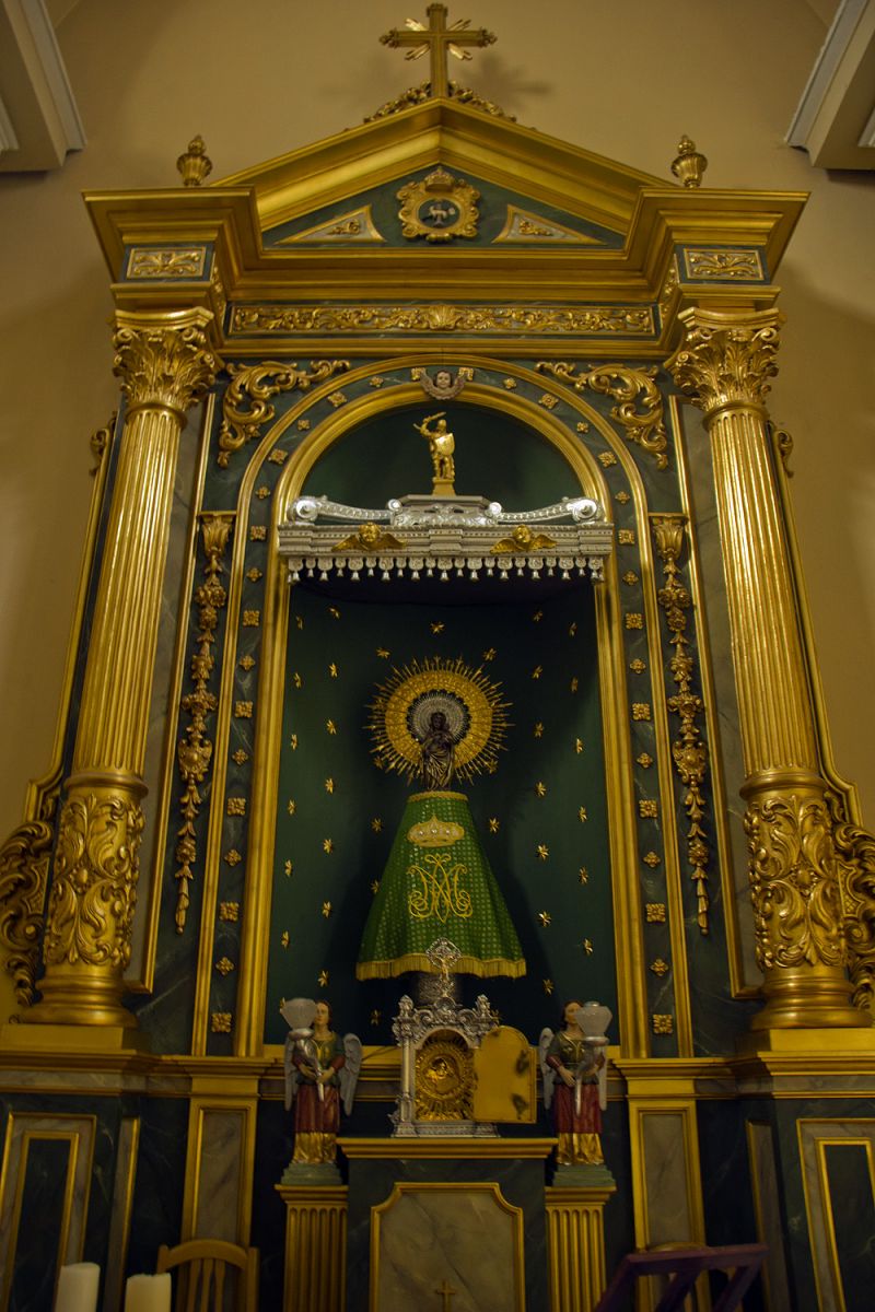 A los pies del templo, en el último tramo de la nave del evangelio, se abre la actual capilla del Pilar (foto 20). Fue edificada en 1890 por la Condesa de la Vega del Pozo, D. ª María Diega Desmaisieres y Sevillano (1852-1916), la cual tenía su residencia en la calle vicalvareña del mismo nombre, esquina a la calle del Jardín de la Duquesa (ya que también ostentaba el título de Duquesa de Sevillano). Hoy en día no resta nada de su gran palacio, cuya ubicación ocupa un solar asilvestrado con algún pequeño resto de lo que fue un jardín romántico, finalmente seccionado por la actual calle de San Cipriano, y el resto de la posesión, sita al norte de esta última calle, ocupada por instalaciones de AENA. La advocación original que le otorgó esta aristócrata de la Restauración fue la de San Juan Bautista; su construcción en ladrillo no desentona del resto de la construcción barroca, si bien está concebido como edificio independiente del resto del templo.