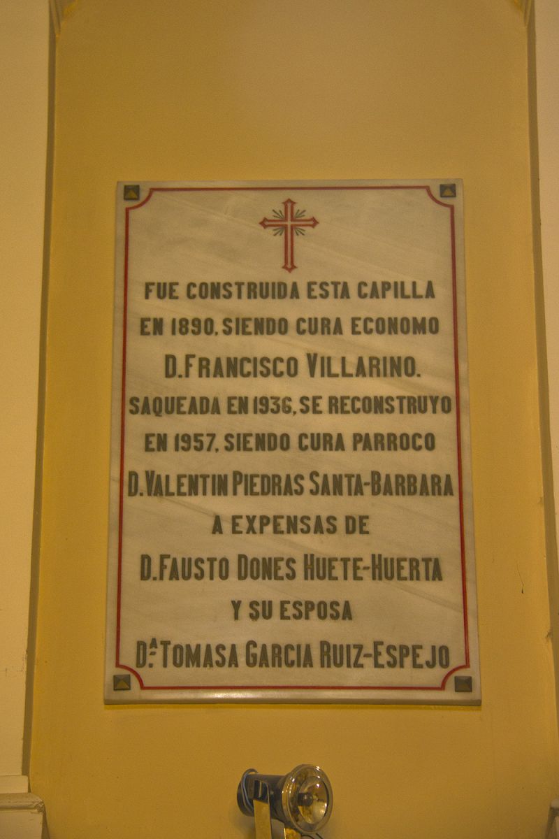Asaltada, igual que el resto del templo, en 1936, no sería restaurada la capilla hasta el año 1957 por un matrimonio prominente de la localidad (foto 21), otorgándosele su actual advocación.