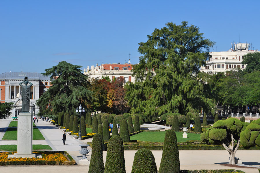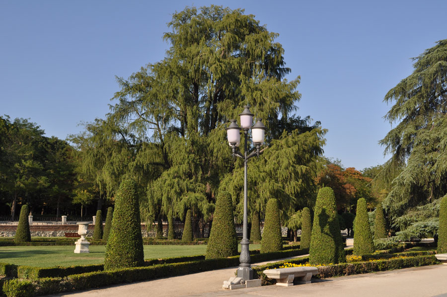 El ahuehuete del Retiro es el árbol más famoso de la ciudad. Con sus 25 metros de altura y su ubicación en el Parterre del Retiro, junto a la puerta de Felipe V y al Casón del Buen Retiro, llama la atención de los observadores paseantes que al acercarse descubren su ancho tronco encarcelado y sus ramas colgantes queriendo tocar el suelo.