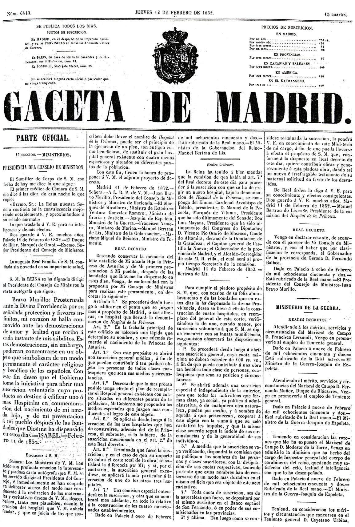 "Bravo Murillo: Prosternada ante la Divina Providencia por su señalada protección y favores infinitos, mi corazón se halla conmovido ante las demostraciones de amor y lealtad que recibo á cada instante de mis súbditos. Estas demostraciones, sin embargo, pudieran concentrarse en un objeto que simbolizara de un modo permanente el carácter religioso y benéfico de los españoles. Con este fin deseo que el Gobierno tome la iniciativa para abrir una suscripción voluntaria cuyo producto se destine á edificar uno ó más Hospitales en conmemoración del nacimiento de mi amada hija, y de mi presentación á mi pueblo después de las bondades que Dios me ha dispensado en estos días. ISABEL. Febrero 11 de 1852”. (sic)
