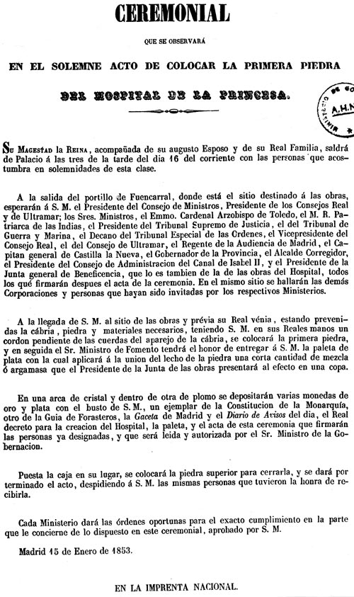 Artículo 1°. Se procederá desde luego á edificar en el punto que se juzgue mas á propósito de Madrid, ó sus afueras, un hospital que llevará la denominación de Hospital de la Princesa... " (sic)