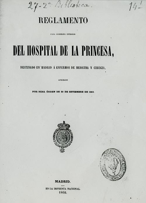 Por Real Orden de 29 de septiembre de 1860 es aprobado el reglamento del Gobierno del Interior para el Hospital de la Princesa. En el artículo 2, se indica que está destinado a la curación de enfermedades comunes, exceptuándose los males sifilíticos, las enajenaciones mentales, las fiebres exantemáticas, las dolencias crónicas incurables y las enfermedades de la piel.