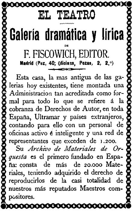 Afortunadamente la situación no llegó a tales extremos, pero el enfrentamiento con Fiscowich le cerró a Chapí la mayoría de los teatros de la capital así como la colaboración de muchos libretistas. La rebeldía del compositor hacia lo que era una situación de abuso y explotación sería uno de los primeros pasos hacia la creación de la Sociedad General de Autores, de la que Chapí sería uno de sus fundadores.