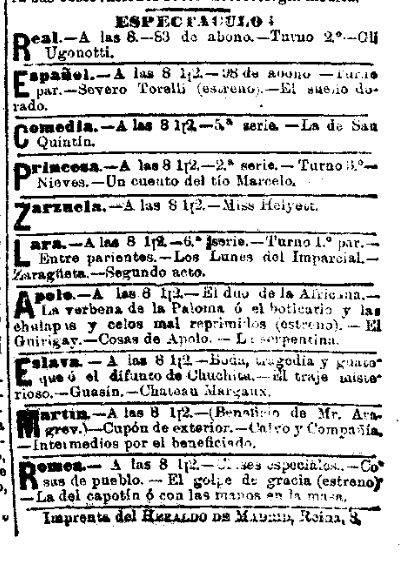 El Liberal, (18 de febrero de 1894): “Las localidades se llegaron á cotizar á precios fabulosos, hasta el punto de que mucha gente se quedara con las ganas de ver el sainete, y por lo tanto, el teatro estaba completamente lleno como en las noches de grandes solemnidades artísticas.”