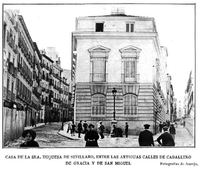 Nuestra historia se remonta a comienzos del siglo pasado, en los años en que estaba naciendo la Gran Vía, cuya creación supuso la desaparición de varias calles e inmuebles. Entre estos se encontraba el palacio de la duquesa de Sevillano, que se alzaba entre las calles de Caballero de Gracia y San Miguel. Cuando su propietaria, Dª María Diega Desmaissières y Sevillano, se enteró del triste destino que le aguardaba a su palacio, condenado a desaparecer bajo la piqueta, fue tanta la pena que sintió que decidió abandonar España para no regresar jamás. La duquesa murió poco después, y cuenta la leyenda que por las noches, sobre el solar del palacio derruido se veía pasear el fantasma de una mujer. Hay quien dice que se trataba de la propia Dª María, que recorría llorando las ruinas de lo que fue su amado palacio.