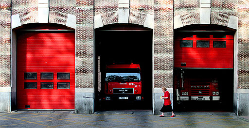 se trata de una oportuna instantánea tomada en la calle Santa Engracia de Madrid, frente al parque número 1 de bomberos, el más antiguo de la capital. Me llamó la atención la elegancia del histórico edificio de ladrillo, así como la simetría asimétrica (3 puertas iguales, pero cada una en un grado diferente de apertura). Por supuesto el hilo conductor de los elementos de la foto es el color rojo, el cual no es casual pues me tiré aprox. una hora y media de guardia hasta que apareció... la mujer de rojo. Creo que la foto presentada conjuga perfectamente los dos elementos de que trata el concurso: la ciudad de Madrid (un edificio histórico), y sus habitantes (la mujer de rojo).