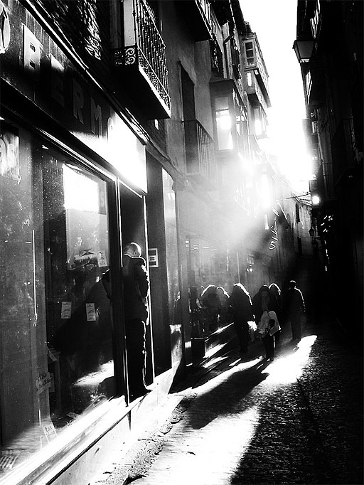 Calle de Lavapies en el ocaso con un señor en el umbral de la puerta de su tienda iluminada por un rayo de sol y mujeres avanzando.