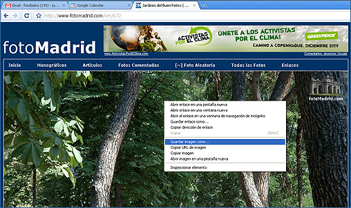 Si deseamos que el tamaño final sea 60cm o menor simplemente basta con descargar la foto de la web. Puedes hacerlo desde la ventana donde está la foto en grande, haciendo click con el botón derecho sobre la foto y seleccionado "guardar imagen como...". Con eso se bajará la foto que quieras a tu PC. Fíjate bien donde la guardas, porque luego tendremos que usarla para revelarla ampliada sobre el lienzo o sobre dibond.