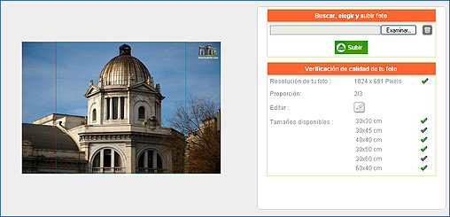 Por ejemplo, yo voy a elegir dibond (sobre aluminio lacado). Al hacer click se abrirá una ventana donde aparece un formulario. En el cuadro que dice "Buscar, elegir y subir foto" le damos y buscamos la foto que hemos guardado anteriormente. Una vez está seleccionada, le damos al botón subir. La foto comienza a enviarse al laboratorio, y cuando está subida, aperece un resumen de los tamaños a las que puede imprimirse. Le damos a siguiente.
