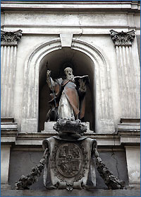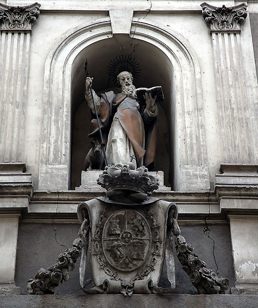 En el segundo cuerpo de la fachada aparece una hornacina en la que luce una escultura del titular del templo (Fig. 2), realizada en el primer tercio del siglo XIX, al tiempo de la terminación de la fachada, en el que se le muestra con su hábito característico en el que luce una cruz en forma de “Tau”, ligeramente tapada, y que también remata su báculo, y acompañado de un cerdo. Su labra se atribuye al escultor asturiano Juan Alonso de Villabrille y Ron (1663-1732) del que apenas se conoce obra con certeza; la única escultura de atribución segura es la Cabeza degollada de san Pablo (1707), de impactante dramatismo. En Madrid se le atribuyen otras obras, como el apostolado existente en el tambor de la Capilla de San Isidro en la Iglesia de San Andrés, y las esculturas de San Isidro y de Santa María de la Cabeza en el Puente de Toledo.