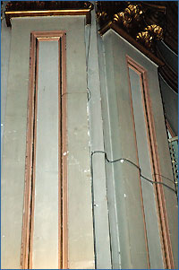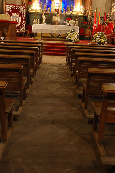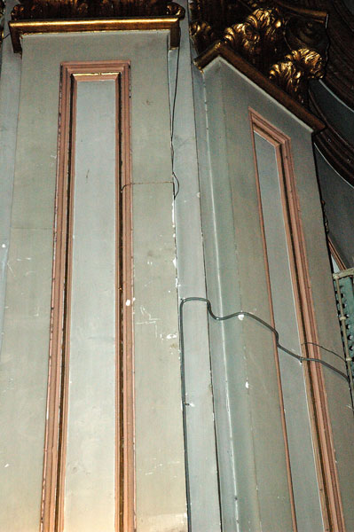 A lo largo de nuestra visita acompañados por el Padre Villar, pudimos constatar el lamentable estado de conservación que presenta el templo. Las bóvedas y nervios mostraban un aspecto deslucido y grisáceo (Fig. 17), con numerosos desconchones, perforaciones e incluso grietas de distintos calibres. Los retablos, y muchas de las imágenes que los cobijan también están necesitados de una urgente restauración; y el solado de la iglesia muestra un entarimado en unas condiciones deplorables (Fig. 18).