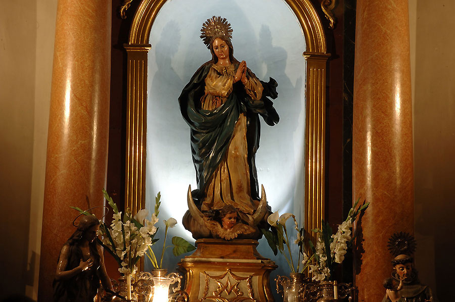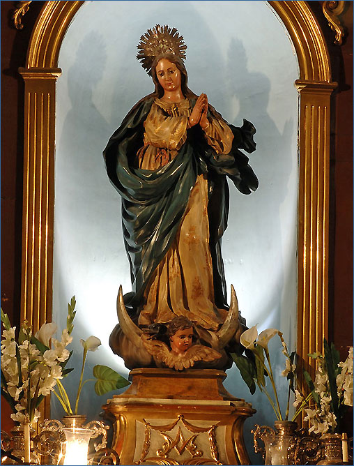 La siguiente capilla contiene un retablo del siglo XVIII compuesto de dos columnas que sostienen un entablamento. En el mismo hallamos una hermosa imagen de la Virgen María en su Inmaculada Concepción (Fig. 4), talla grande y majestuosa, anónima pero correspondiente a talleres madrileños, influenciados por la escuela de Pedro de Mena, de finales del siglo XVIII o inicios del XIX y perteneciente a la época en que los escolapios tomaron posesión del edificio. En la misma capilla contemplamos una bella imagen de Santa María Magdalena penitente, también dieciochesca que sigue el modelo popularizado por Pedro de Mena al aparecer representada vestida de estera de palma, descalza y con la melena al descubierto mientras contempla compungida el crucifijo que porta en una de sus manos. De esa misma iconografía se conserva en Madrid otra bella talla en el Monasterio de las Descalzas Reales.