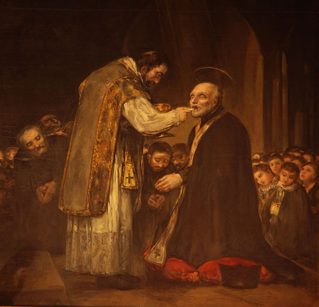 El original se conserva por los escolapios en una de sus casas, en concreto en el Museo Escolapio de Madrid, sito en la C/ Gaztambide, 65. Dicho instituto alberga otra joya, “Jesús en el Huerto de los Olivos”, también de Goya. La obra goyesca referida en primer lugar fue trasladada a dicho museo toda vez que la iglesia actualmente no reúne las condiciones de seguridad ni medioambientales que garanticen la adecuada conservación del lienzo. Encargado por los escolapios al genial artista, fue pintado en 1819, cobrando por él un total de 16.000 reales. No obstante, Goya, antiguo alumno del colegio de los escolapios de Zaragoza, finalmente devolvió parte de dicho importe por los buenos recuerdos que le inspiraba esta fase de su vida como estudiante. La presente obra está inspirada en “La última Comunión de San Jerónimo”, pintada por el italiano natural de Bolonia “Domenichino” (Domenico Zampieri, 1581-1641). En la obra de Goya podemos observar al muy anciano José de Calazanz (91 años) recibiendo arrodillado la comunión de manos de un sacerdote, observado por varios religiosos de su orden, y los pequeños alumnos del colegio. Es una bella pintura tenebrista, en la que los estudiosos han querido ver una influencia del estilo de Rembrandt.