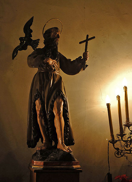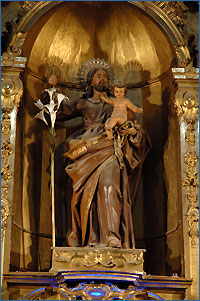 Dejando el presbiterio nos dirigimos al lateral izquierdo del templo (“evangelio”) y en la primera capilla que encontramos podemos contemplar un vistoso retablo de madera dorada y estofada, datado en las postrimerías del siglo XVIII (Fig. 10) pero de fuerte estilo barroco, de un solo cuerpo, entablamento convexo partido, limitado por columnas estriadas de orden corintio, que alberga hornacina con escultura de San José con el Niño de indudable categoría artística, y datado en el siglo XVII, es atribuida a Sebastián Herrera Barnuevo> (1619-1671), en el que destaca el modelado del manto de José; con el brazo izquierdo sustenta al niño, mientras camina apoyándose en su báculo, ornado de lirios como símbolo de castidad.